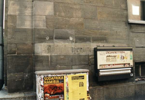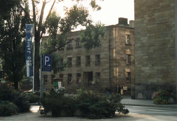 | Die folgenden Bilder wurden mir freundlicherweise von Thomas Kees zur Verfügung gestellt. Das Stenohaus wurde erst Mitte der 90'er Jahre abgerissen. Links im Bild sieht man noch die Flagge zur 800-Jahr Feier. Damals stand das Stenohaus also noch. Rechts davon ist die ehemalige EVO, früher "Haus der deutschen Erziehung", heute EON. |